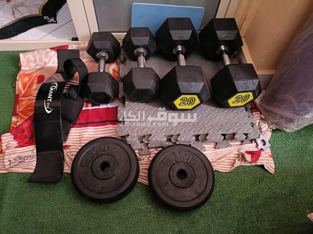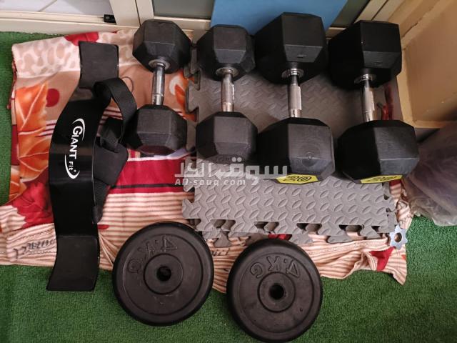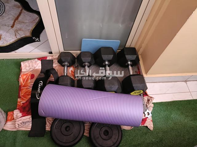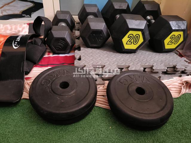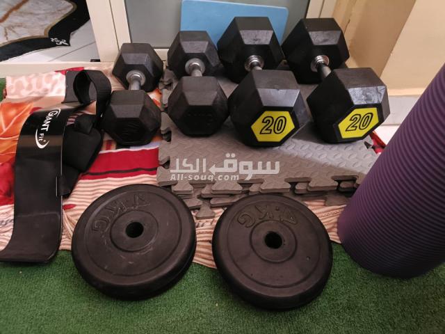 2 دمبل 10ك 2 دمبل 20ك 4 طاره 4ك 4 كواتش فل 1 مفرش سفنج لتمارين البطن 1 حامل لتمارين الذراع