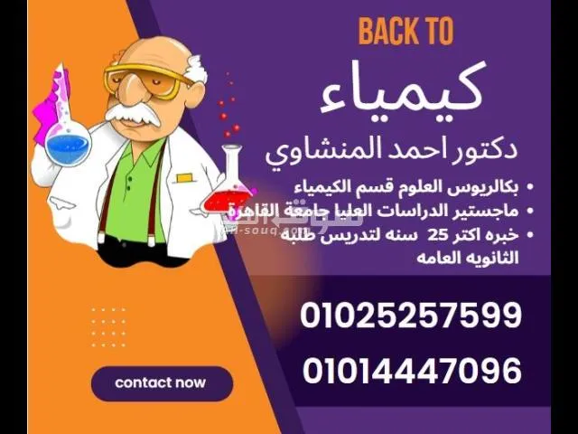 مستر احمد منشاوى حاصل على بكالوريوس قسم كيمياء وماجستير الدراسات العليا جامعة القاهرة خبرة 20 عاما فى تدريس مادة الكيمياء لطلاب المدارس الدولية واللغات واعربى تحقيق نتائج ممتازة بفضل الله