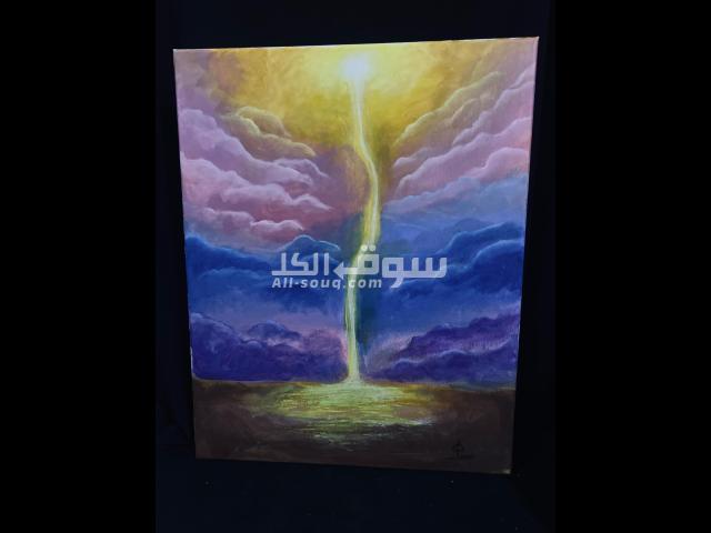 لوحة تجسد لحظة التقاء السماء بالبحر عبر عمود نور سماوي، كأنها بوابة سرية بين العوالم، حيث يذوب الأفق وتختفي الحدود. الألوان الحالمة والانسيابية تجعل المشاهد يشعر وكأنه على وشك عبور نحو عالم آخر، مليء بالسلام والبهاء.ضهر المنضر في خيال الرسال حين ماتت امه في حادث احتراق منزل وهوا يشاهد من بعيد وينضر لسماء وعيونه تفيض بدموع كان يخايل الى تفكيره نور ينزل من السماء الى الارض و امه تصعد السماء
