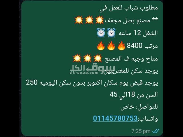 مطلوب شباب للعمل في مصنع توابل بصل في ٦ اكتوبر الشغل 12 ساعه مرتب 10750 متاح وجبه ف المصنع يوجد سكن يوجد قبض يوم سكان اكتوبر بدون سكن اليوميه 300ج ووجبه السن من 20 الي 45 للتواصل 01005883952