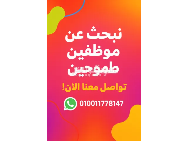 مطلوب فوراً: 20عامل لمصنع مستحضرات تجميل في ٦ اكتوبر فرصة عمل ممتازة بمميزات مغرية! وظيفة: مصنع مستحضرات تجميل الراتب: *10000* جنيه مصري شهرياً (عمل 30 يوماً). ساعات العمل: 12 ساعة يومياً. سكن مفروش ومجاني. مواصلات مجانية من السكن إلى المصنع والع****. سلف يومية. زيادة سنوية في الراتب. الشروط المطلوبة: السن: من 17 سنة إلى 50 سنة. جميع ال******يات...