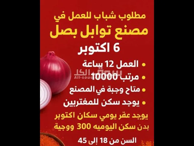 مطلوب شباب للعمل في *مصنع توابل بصل* في ٦ اكتوبر