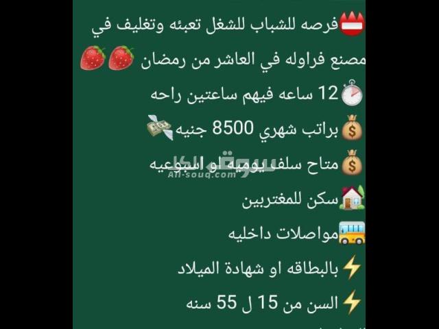 مطلوب عمال انتاج شباب فقط في العاشر من رمضان لمصنع طماطم ومواد غذائيه براتب 9000 جنيه 12 ساعه السن من 20 الى 60 سكن للمغتربين ونقبل سودانيين سلفه يوميه او اسبوعيه تعيين فوري نقبل البطاقه او شهاده الميلاد العدد محدود جدا للاستفسار واتس او فون 0 100 588 39 52