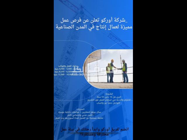 📢 إعلان توظيف – مصانع كبرى بحاجة إلى عمال إنتاج بدون رسوم مقدما 🕐 نظام العمل: شيفتات صباحي ومسائي 💰 المرتب: مجزي + حوافز شهرية 🎯 الشروط: السن من17 حتى 55سنة بنات وشباب الجدية والانضباط في العمل 📞 للتقديم يُرجى إرسال (الاسم + السن + المنطقة) في رسالة خاصة، وسيتم التواصل فورًا لتحديد موعد المقابلة.