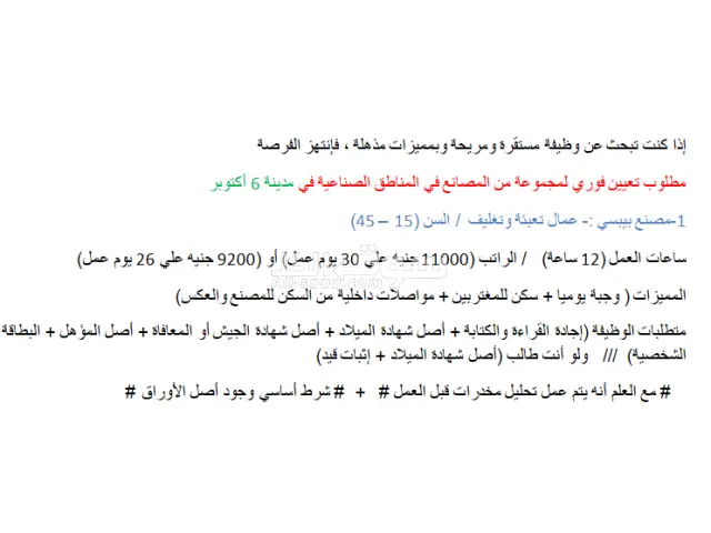 مطلوب شباب للعمل في مصنع توابل بصل في ٦ اكتوبر الشغل 12 ساعه مرتب 10750 متاح وجبه ف المصنع يوجد سكن للمغتربيين يوجد قبض يوم سكان اكتوبر بدون سكن اليوميه 300ج ووجبه السن من 18الي 45 للتواصل 01067742386